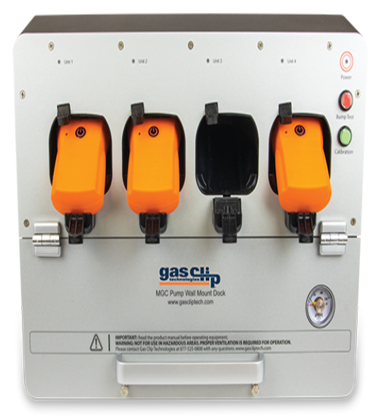The Gas Clip Technologies MGC Pump Clip Dock is an all-in-one stand-alone docking station designed for maximum testing efficiency and portability. It tests up to four detectors simultaneously, reducing the testing time and gas usage.